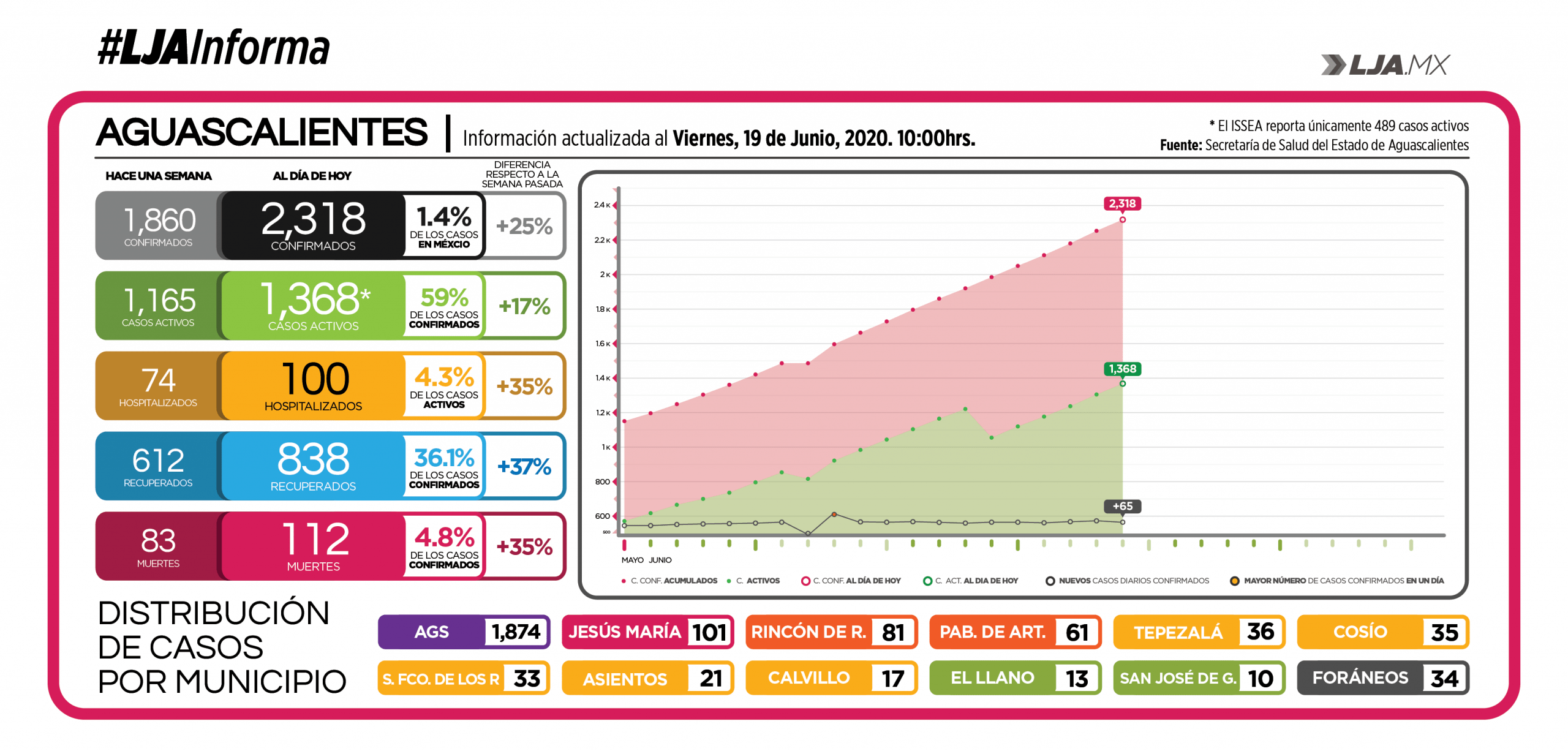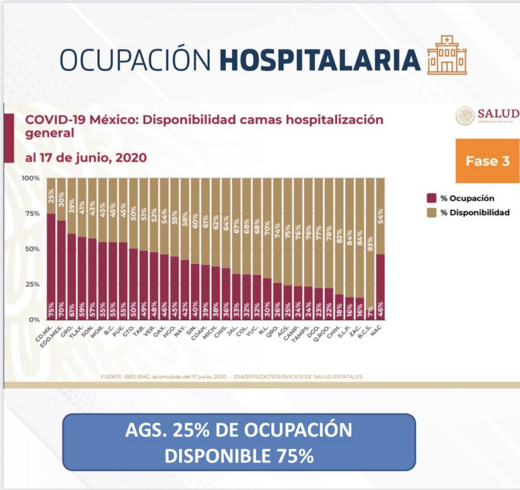 Con la cuarta parte de camas de terapia intensiva y casi la mitad de camas regulares para COVID-19 ocupadas. Aguascalientes acumula ya 2 mil 318 casos confirmados al 19 de junio