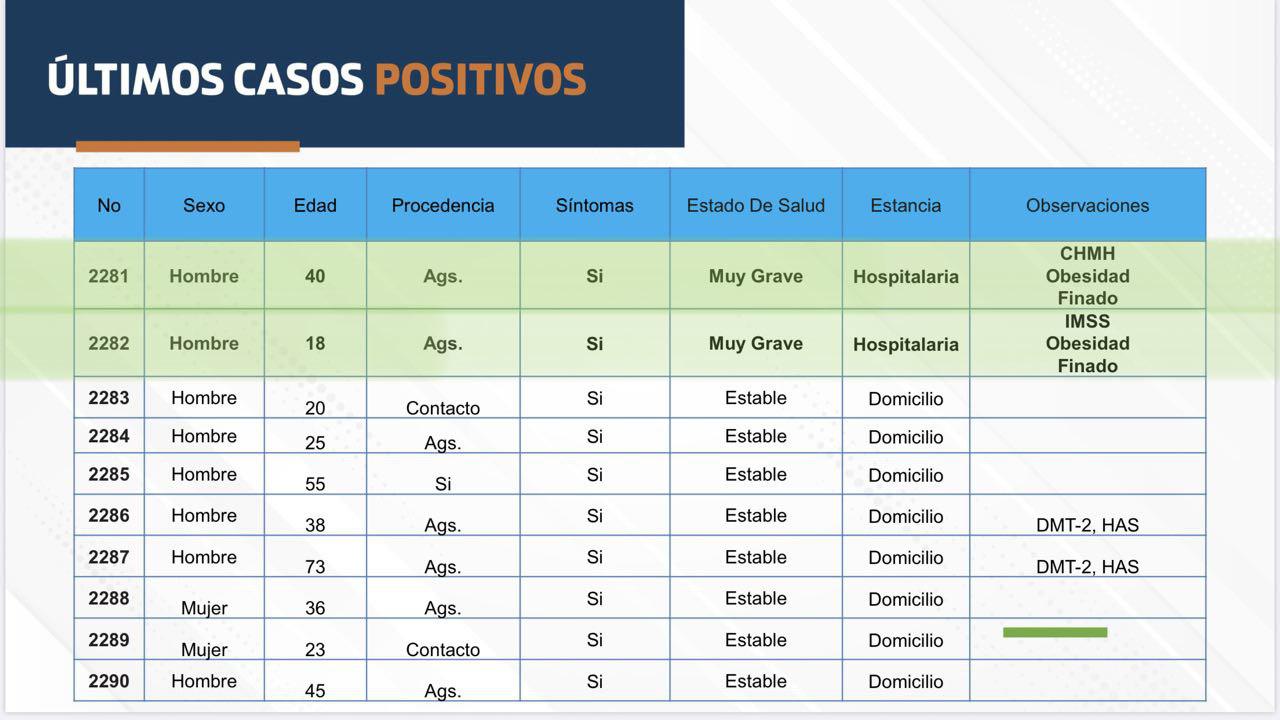 En las últimas 24 horas, Aguascalientes confirmo 2 nuevos decesos por Covid-19, sumando ya 112 muertes a causa de la enfermedad en el estado. Las más recientes defunciones corresponden a un hombre de 54 años con insuficiencia renal crónica un hombre de 40 años atendido en el Hospital Hidalgo y un jóven de 18 años atendido en el IMSS, ambos presentaban obesidad.