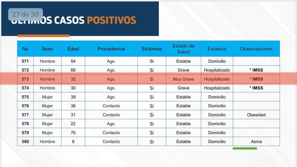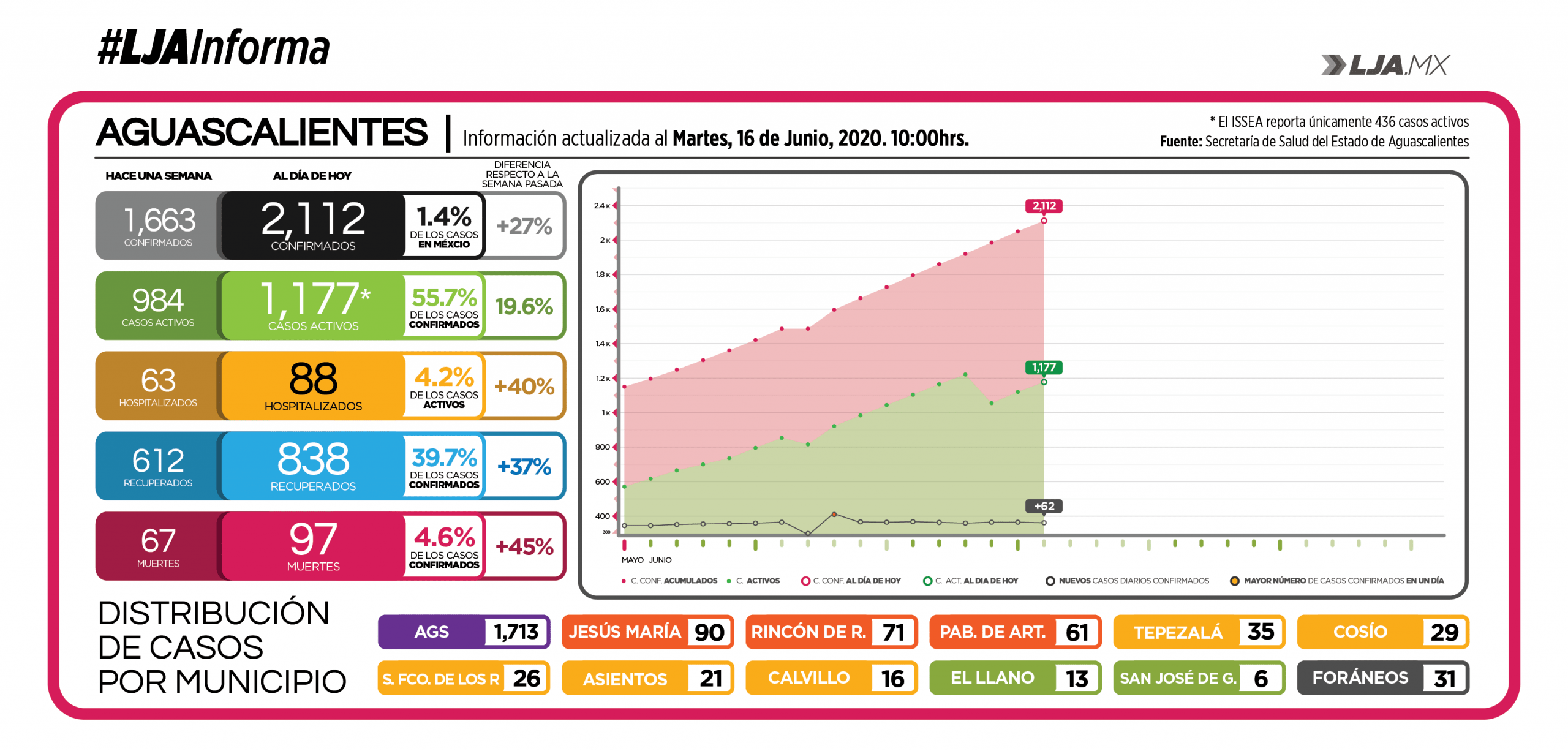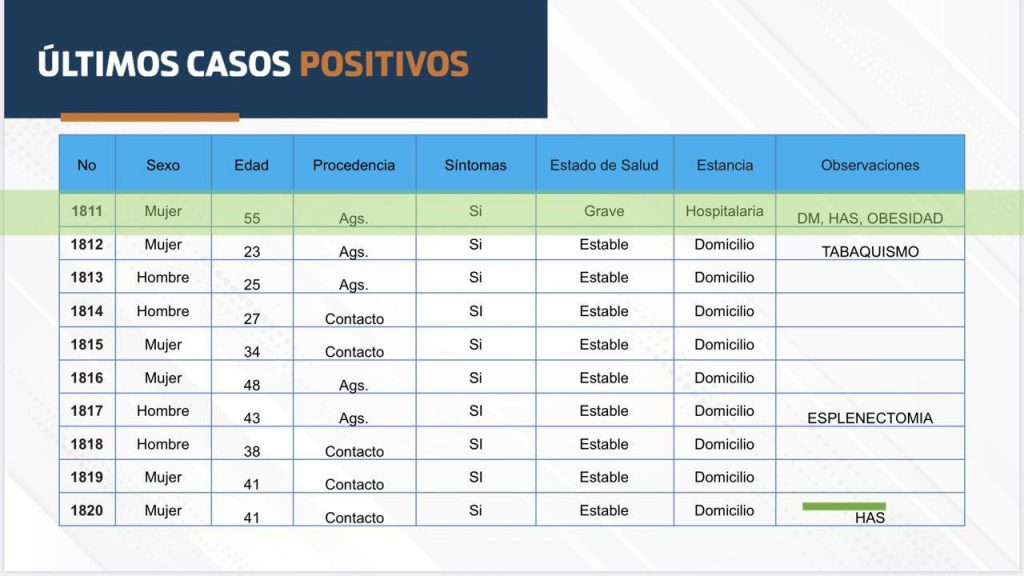Lo que ha resaltado en los últimos reportes de la Secretaría de Salud de Aguascalientes, es la falta de seguimiento médico de los pacientes confirmados de COVID-19 pues, al día de hoy, se desconoce el actual estado de salud del 60% de los casos confirmados acumulados, es decir, actualmente en el estado hay 709 pacientes que no cuentan con una declaración oficial de recuperación o defunción y tampoco se reportan como casos activos.