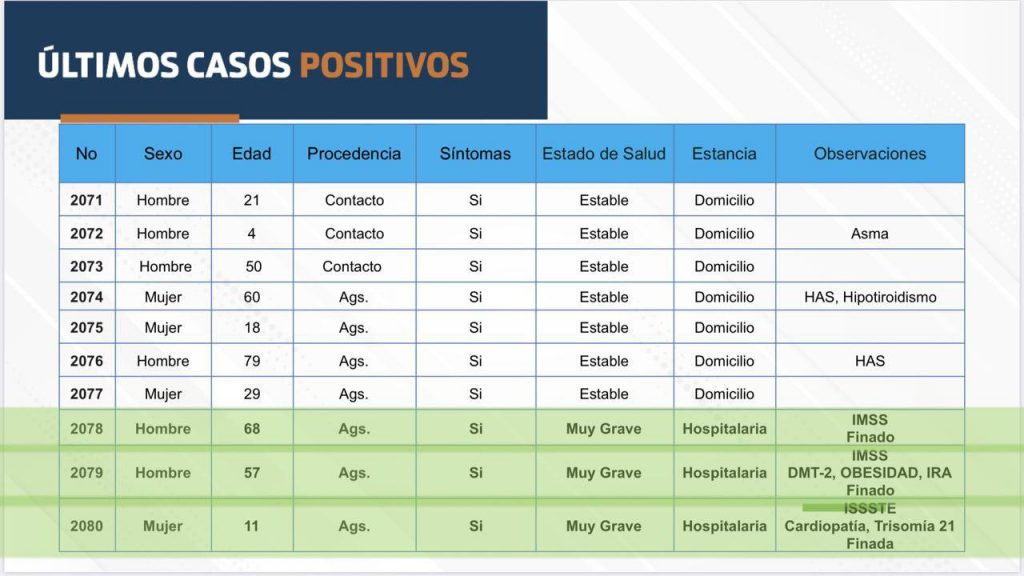 Aguascalientes acumula ya un total de 97 muertes por COVID-19, las últimas 5 confirmadas el día de hoy corresponden a un hombre de 32 años sin comorbilidades notificadas, confirmado con COVID desde el 15 de mayo, quien murió ayer tras un mes de convalecencia en el IMSS; una mujer de 55 años con diabetes, hipertensión y obesidad; un hombre de 68 años sin comorbilidades notificadas; un hombre de 57 años con diabetes tipo 2, obesidad e insuficiencia respiratoria aguda; y una menor de 11 años con cardiomiopatia, todos derechohabientes del IMSS.