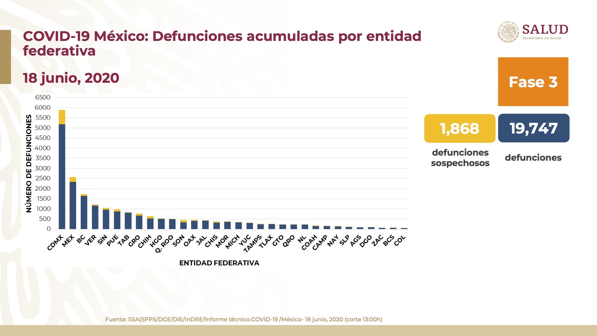 La cifra total de fallecimientos se acerca a los 20 mil, con 19,747, con los 667 que se agregaron el día 18 de junio