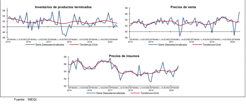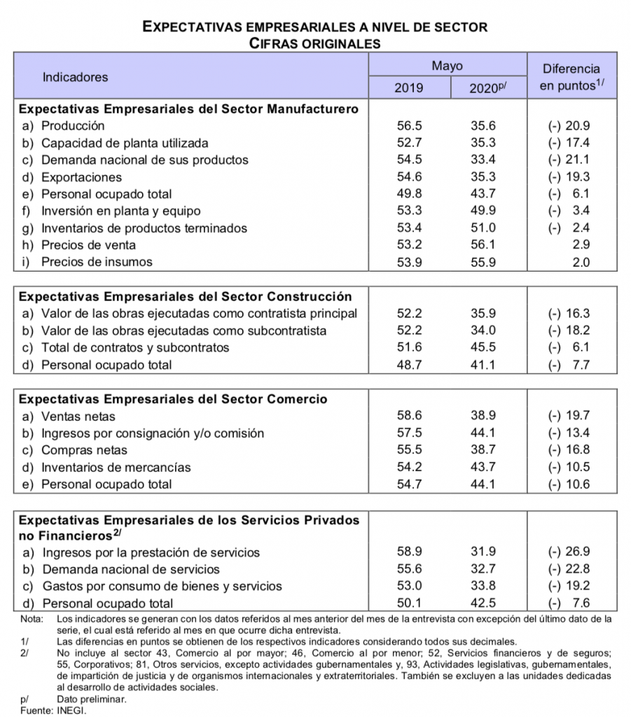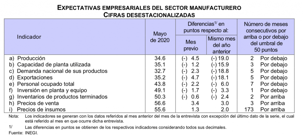 En su comparación mensual, las Expectativas Empresariales del Sector Manufacturero durante el quinto mes de 2020 reportaron el siguiente comportamiento, con cifras desestacionalizadas: