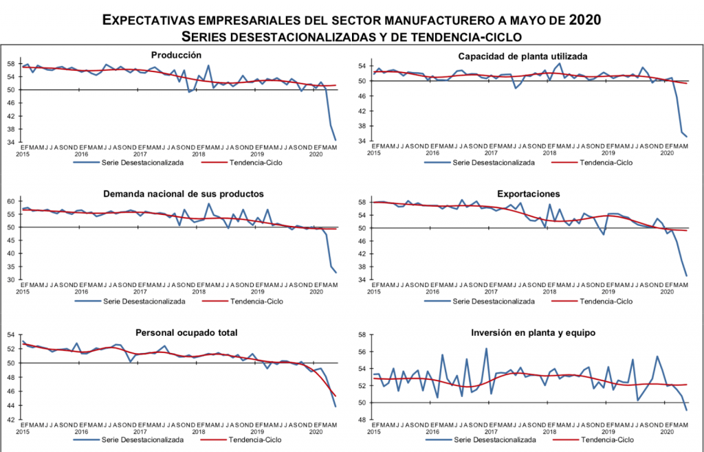 En su comparación mensual y con datos ajustados por estacionalidad, las Expectativas Empresariales en el sector Manufacturero fueron desfavorables en mayo de 2020 frente a las de abril pasado: las de las Exportaciones disminuyeron (‑)4.7 puntos, las de la Producción (‑)4.5 puntos, las de la Demanda nacional de sus productos (‑)2.3 puntos y las del Personal ocupado total fueron menores en (‑)2.2 puntos.