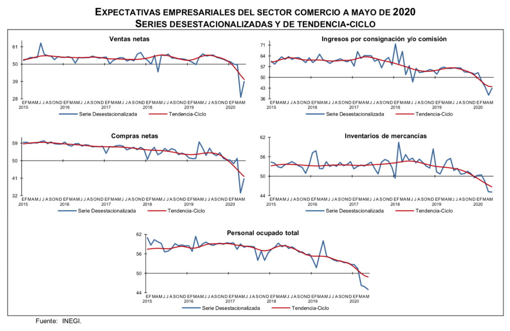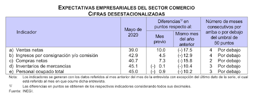 En el sector Comercio, la apreciación sobre las Ventas netas aumentó 10 puntos, la de las Compras netas 7.3 puntos y la de los Ingresos por consignación o comisión creció 4.5 puntos en el quinto mes de 2020 respecto al mes inmediato anterior.