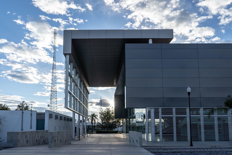Y parece que muchas de las intervencionesarquitectónicas que se han hecho no han identificado este “valor de conjunto” que existe en el complejo. Ahí está muy claro el caso de la sala de conciertos de la Orquesta Sinfónica de Aguascalientes. Un recinto donde se practica y promueve una de las Bellas Artes, lugar que creo debería expresar la elegancia, refinamiento y nobleza de la música clásica. En realidad, vemos un edificio que olvida su contexto, contrastando con un lenguaje propio, compuesto por volúmenes zigzageantes de alucobond; similar al deun banal strip mall o incluso de alguna bodega pobremente decorada. Misma construcción que no cuida los remates visuales del conjunto existente, incapaz de redefinir y aportar a las relaciones de volúmenes que ya vemos construidas. A pesar de su escala y vocación, existe tímidamente rodeado de palmas enfermas, incluso eclipsado por un pequeño edificio de ladrillo y muros blancos que está justo enfrente y que resulta más atractivo. Lo que me preocupa es que es un edificio que debería de expresar las aspiraciones culturales de la ciudad, redefinir al aguascalentense contemporáneo desde la historia.