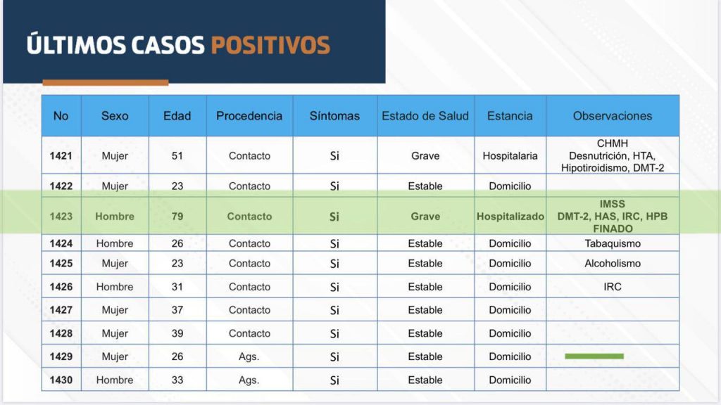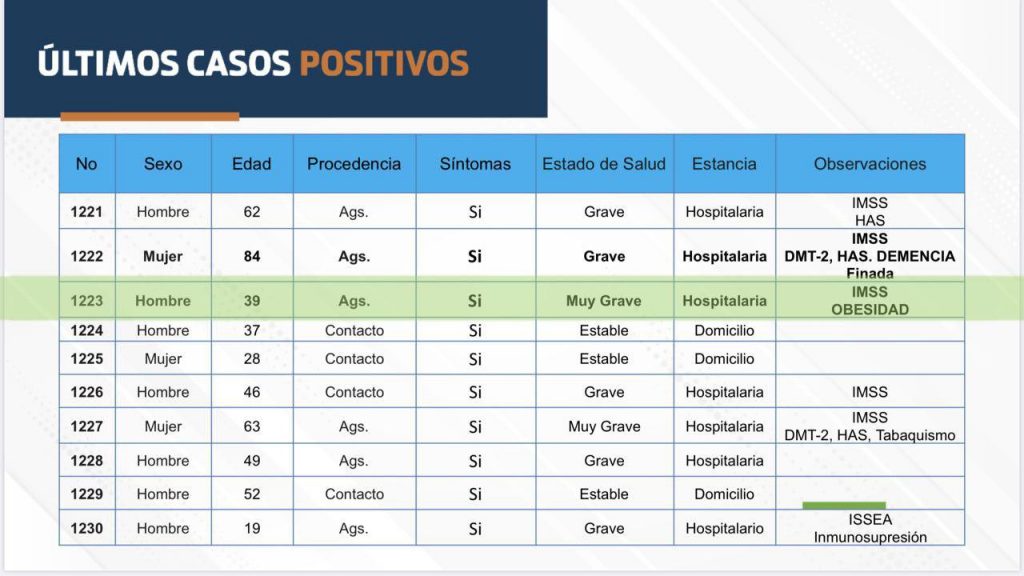 Aguascalientes registra ya un total de 62 muertes por COVID-19, las cuatro más recientes, reportadas hoy, corresponden a un hombre derechohabiente del IMSS de 39 años y una mujer de 51, ambos con obesidad; una mujer de 63 años, derechohabiente del IMSS, con hipertensión; y un hombre de 79 años, derechohabiente del IMSS, con diabetes tipo 2, hipertensión, insuficiencia renal y padecimientos de próstata.