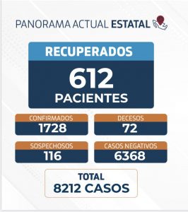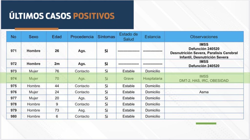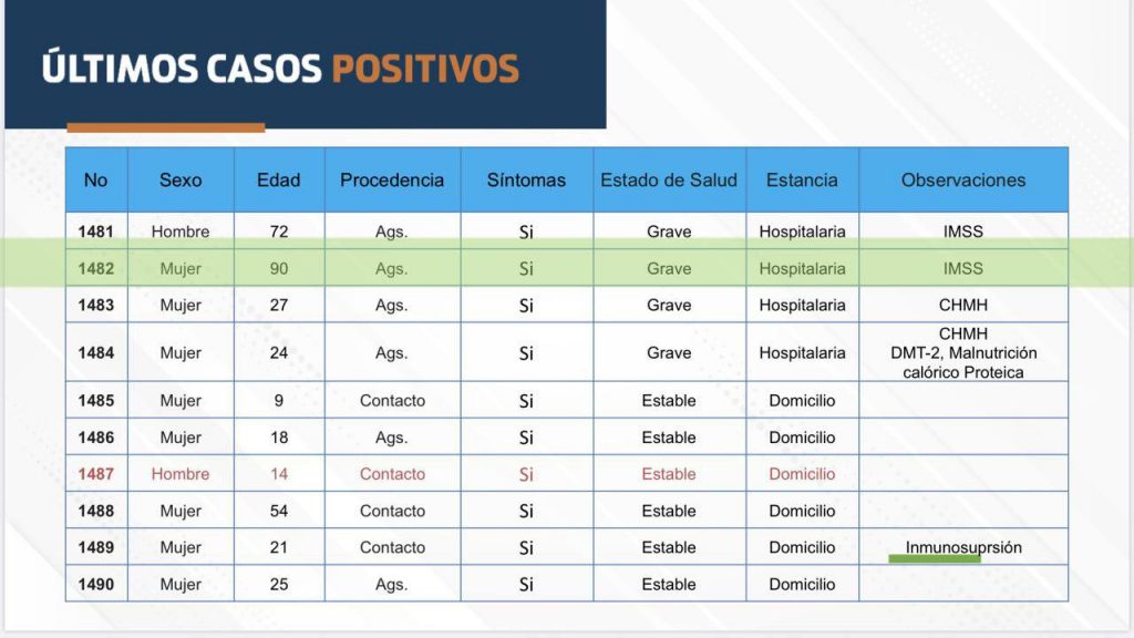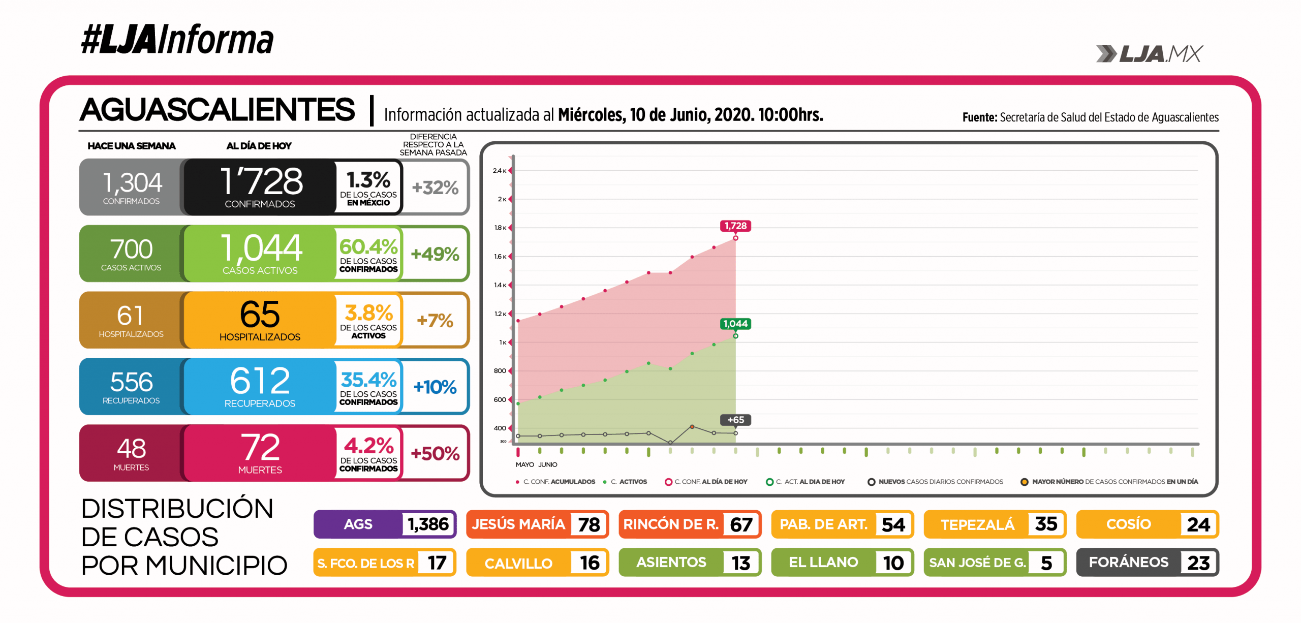 Nuevamente, Aguascalientes confirmar 5 muertes y 65 casos más de COVID-19. Ya son mil 728 contagios acumulados al 10 de junio