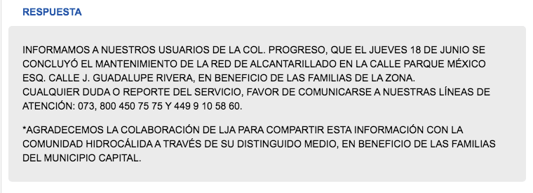 Veolia Aguascalientes respondió a los denuncias ciudadanas que en días anteriores hicieron los vecinos de la colonia El Progreso y Ortega Douglas, al oriente de la ciudad, a través de la nota de nuestra reportera Claudia Rodríguez Loera titulada “Incomunicadas, las colonias Progreso y Ortega Douglas por desechos del drenaje en Aguascalientes” y que también aparece en nuestra columna editorial “La Purisima Grilla” del día 18 de junio en el apartado titulado “La del estribo”
