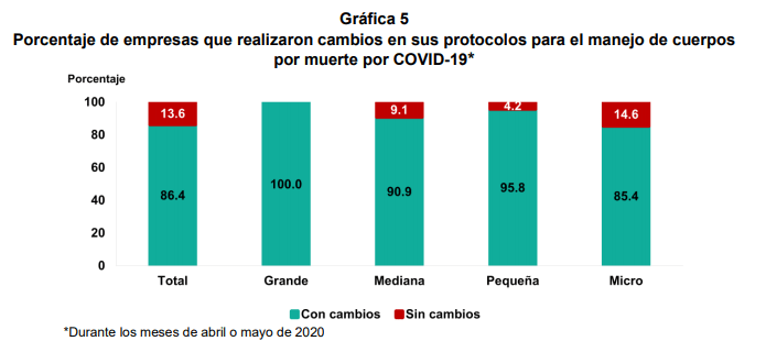 Aproximadamente nueve de cada diez empresas realizaron cambios en los protocolos para el manejo de cuerpos por muertes relacionadas con Covid-19 en abril o mayo de 2020, situación que se presentó en la totalidad de las empresas grandes. El 14.6% de las microempresas no realizó cambios en sus protocolos en el manejo de cuerpos por muertes relacionadas con Covid-19.