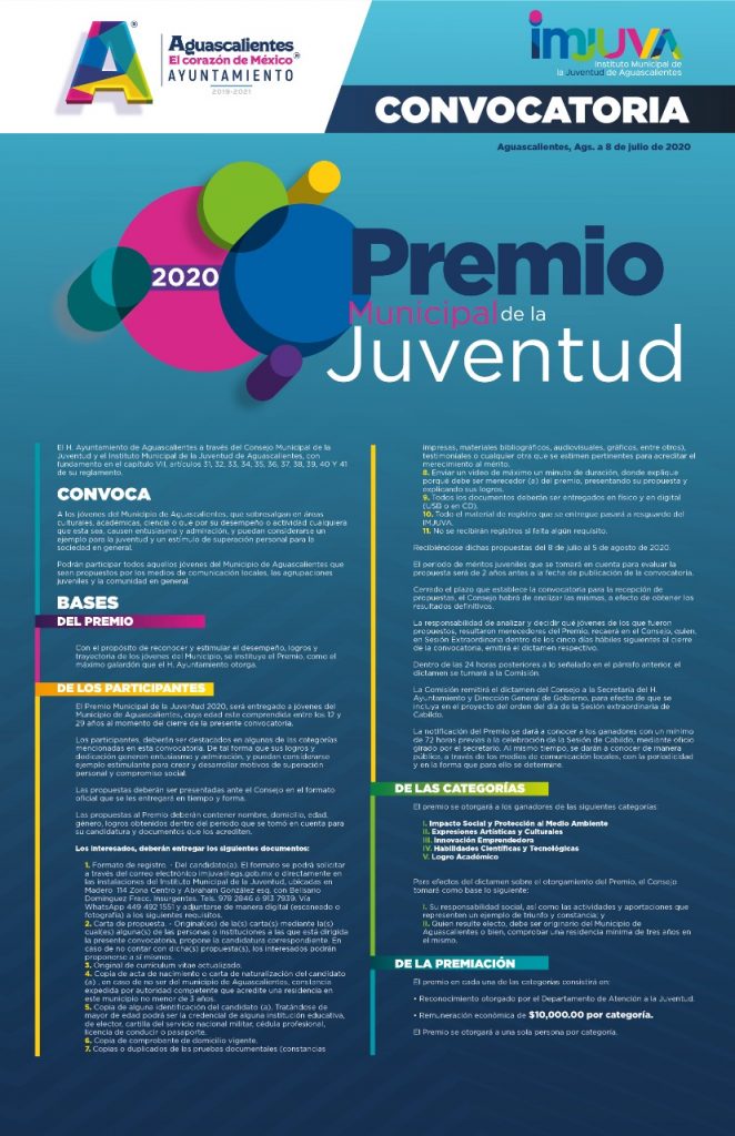 Con el objetivo de reconocer y estimular el desempeño de los jóvenes que han destacado por sus logros en diversas actividades culturales, académicas, deportivas y de ciencias, el Municipio de Aguascalientes abre la convocatoria al Premio Municipal de la Juventud 2020.