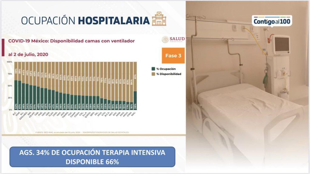 El Instituto Mexicano del Seguro Social es el centro de salud que sigue reportando la mayor carga de hospitalizaciones con un total de 77 camas ocupadas (43 regulares y 34 de terapia intensiva), seguido por el Hospital Miguel Hidalgo con 28 camas (11 regulares y 17 de terapia intensiva) y el ISSSTE con 4 camas de (2 regulares y 2 terapia intensiva). Esto representa, según el reporte de la Secretaría de Salud Nacional, una ocupación hospitalaria del 25% para camas regulares y del 34% para camas de terapia intensiva.