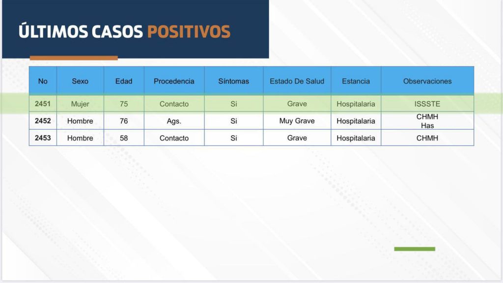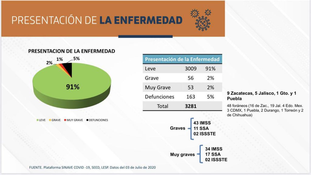 [ev_quote cite=”” align=”left” fontcolor=”#d60057″ bgcolor=”#ffeb3b”]Ya son 4 los casos de pacientes que han muerto pasado un mes de haber contraído COVID-19[/ev_quote]De estos 3 mil 281 casos de pacientes de COVID-19 acumulados en el Estado, el Instituto de Salud del Aguascalientes reporta solamente 578 pacientes activos, mil 579 recuperaciones y 163 decesos, dándonos un total de sólo 2 mil 320 pacientes que cuentan con seguimiento médico, es decir, al día de hoy, hay 961 pacientes de COVID-19 que el ISSEA no reporta dentro de su desglose de casos, desconociendo por completo su estado de salud actual y el estatus del virus en su cuerpo, lo que puede llegar a representar un grave riesgo de contagio.
