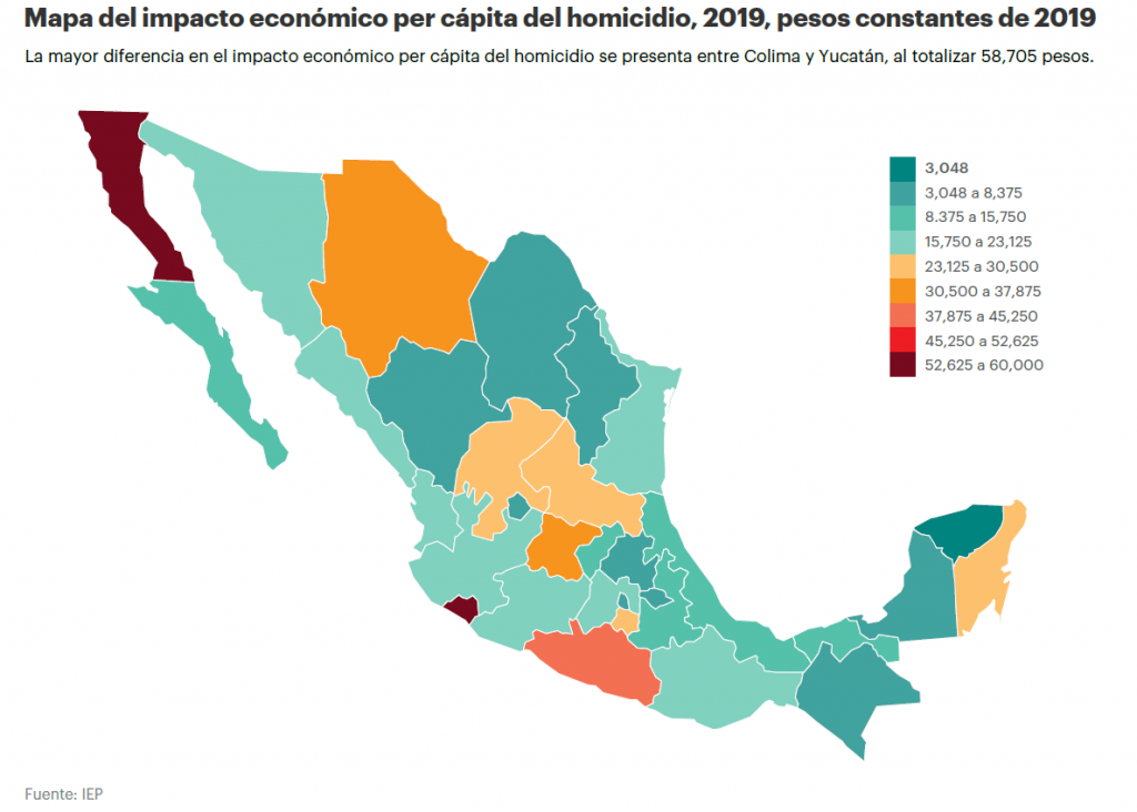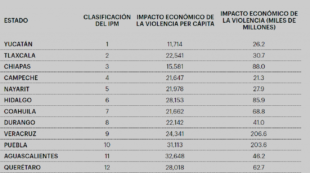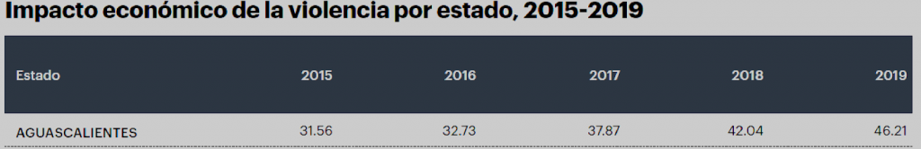 Aguascalientes, que se clasifica en el lugar 11 del IPM 2020, tuvo el impacto per cápita más alto por delitos con violencia, lo que se derivó de poseer la mayor tasa de violencia sexual. El impacto per cápita de Aguascalientes por violencia sexual ascendió a 8,412 pesos en 2019.