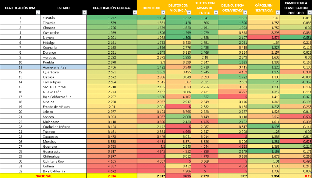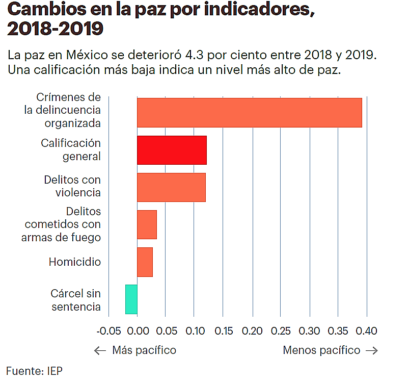 El IPM se basa en la metodología del Índice de Paz Global (IPG), la más reconocida medición de la paz en el mundo, que ha sido elaborado por el IEP cada año desde 2007. De acuerdo con los cánones internacionales la paz en México se ha deteriorado un 4.3% de un año a otro, básicamente por crímenes de la delincuencia organizada.