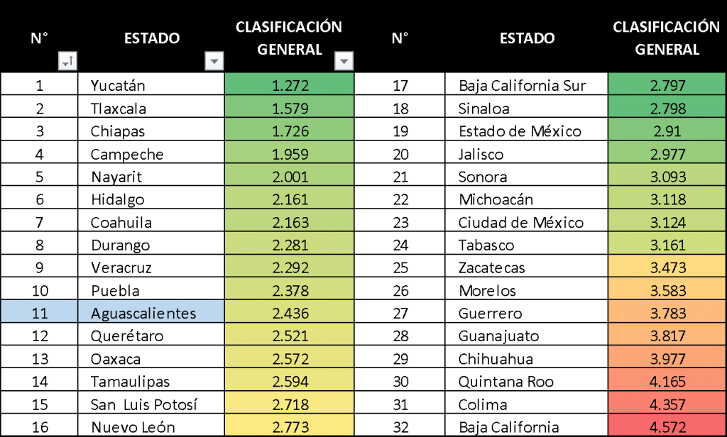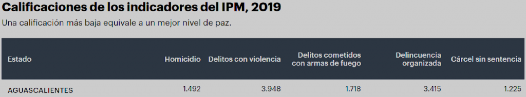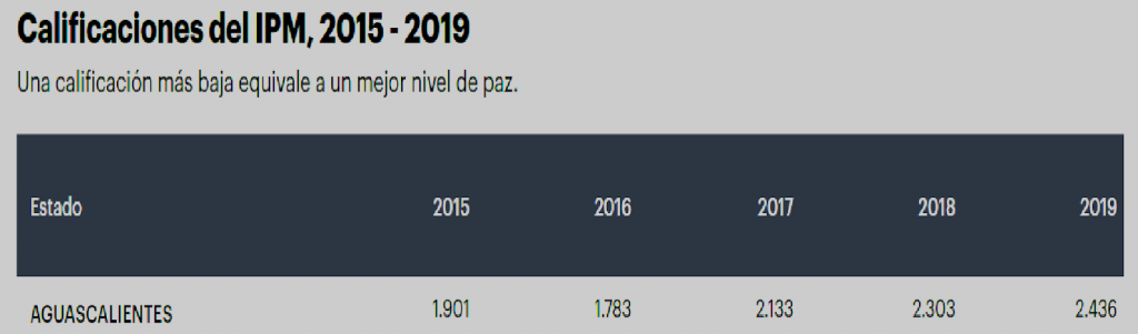 No obstante el deterioro de 0.09 puntos –3.1%– en su calificación general, Aguascalientes sigue siendo uno de los estados en México con mayor Paz Positiva. Mostró avances sólidos en los Pilares Distribución equitativa de los recursos y Libre flujo de información, derivados de las reducciones en pobreza y marginación social, y de mejoras en el acceso de los hogares a Internet.