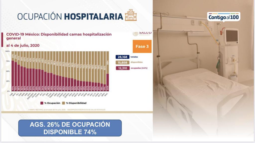 El Instituto Mexicano del Seguro Social es el centro de salud que sigue reportando la mayor carga de hospitalizaciones con un total de 77 camas ocupadas (43 regulares y 34 de terapia intensiva), seguido por el Hospital Miguel Hidalgo con 25 camas (11 regulares y 14 de terapia intensiva) y el ISSSTE con 4 camas de (2 regulares y 2 terapia intensiva). Esto representa, según el reporte de la Secretaría de Salud Nacional, una ocupación hospitalaria del 26% para camas regulares y del 28% para camas de terapia intensiva.