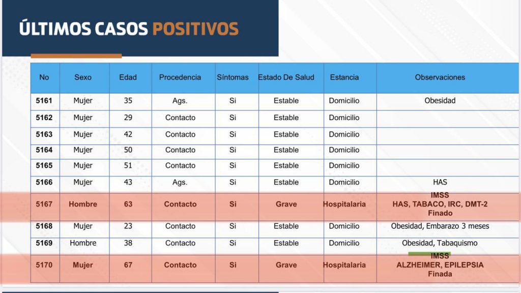 En las últimas 24 horas, Aguascalientes ha registrado un incremento de 68 casos de Covid-19 y 6 muertes a causa de la enfermedad respiratoria, con este aumento el estado ya acumula 5 mil 177 contagios históricos de Covid y 276 muertes, desde el inicio de la pandemia en lo local.