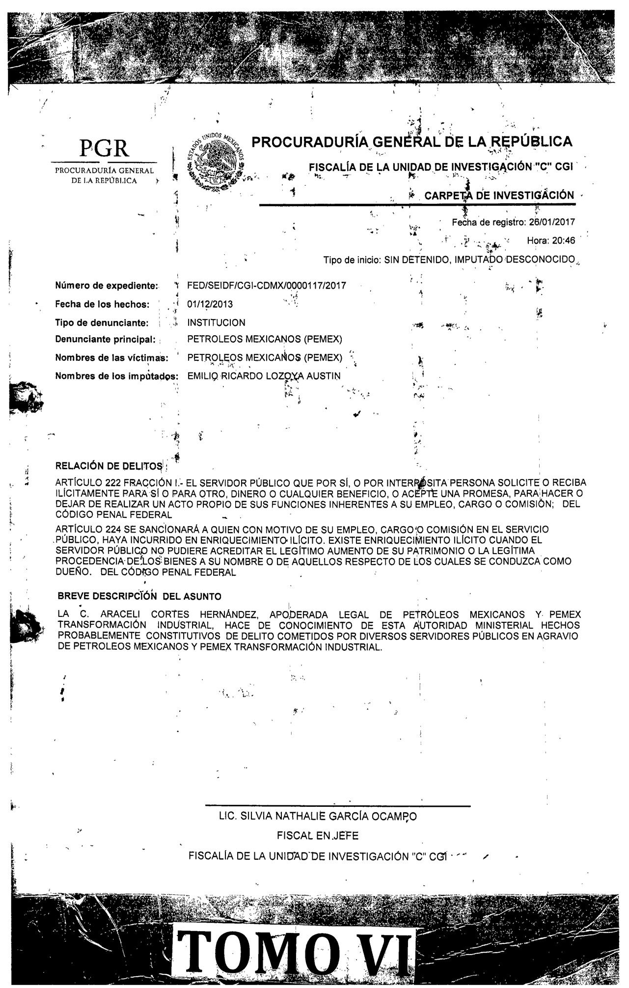 El 26 de enero de 2017, Pemex presentó una denuncia de hechos ante la Procuraduría General de la República (ahora Fiscalía General de la República) en contra de quien resultara responsable, por posibles actos delictivos ocasionados en su contra.