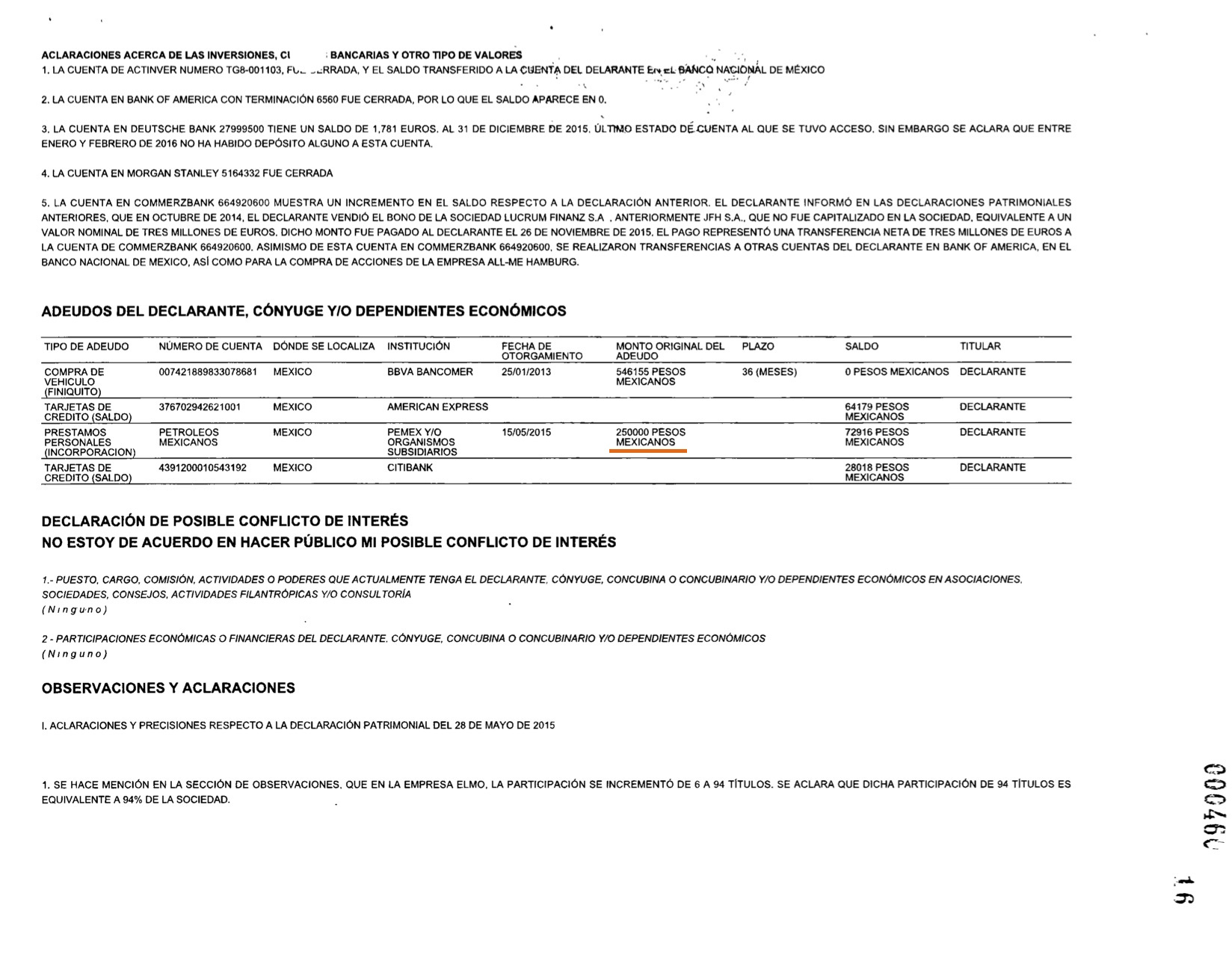 En la declaración del 28 de mayo de 2015 incluyó otra cuenta de cheques en el extranjero con Deutsche Bank con 2 mil 62 euros y en los adeudos una nueva tarjeta de crédito con Citibank.
