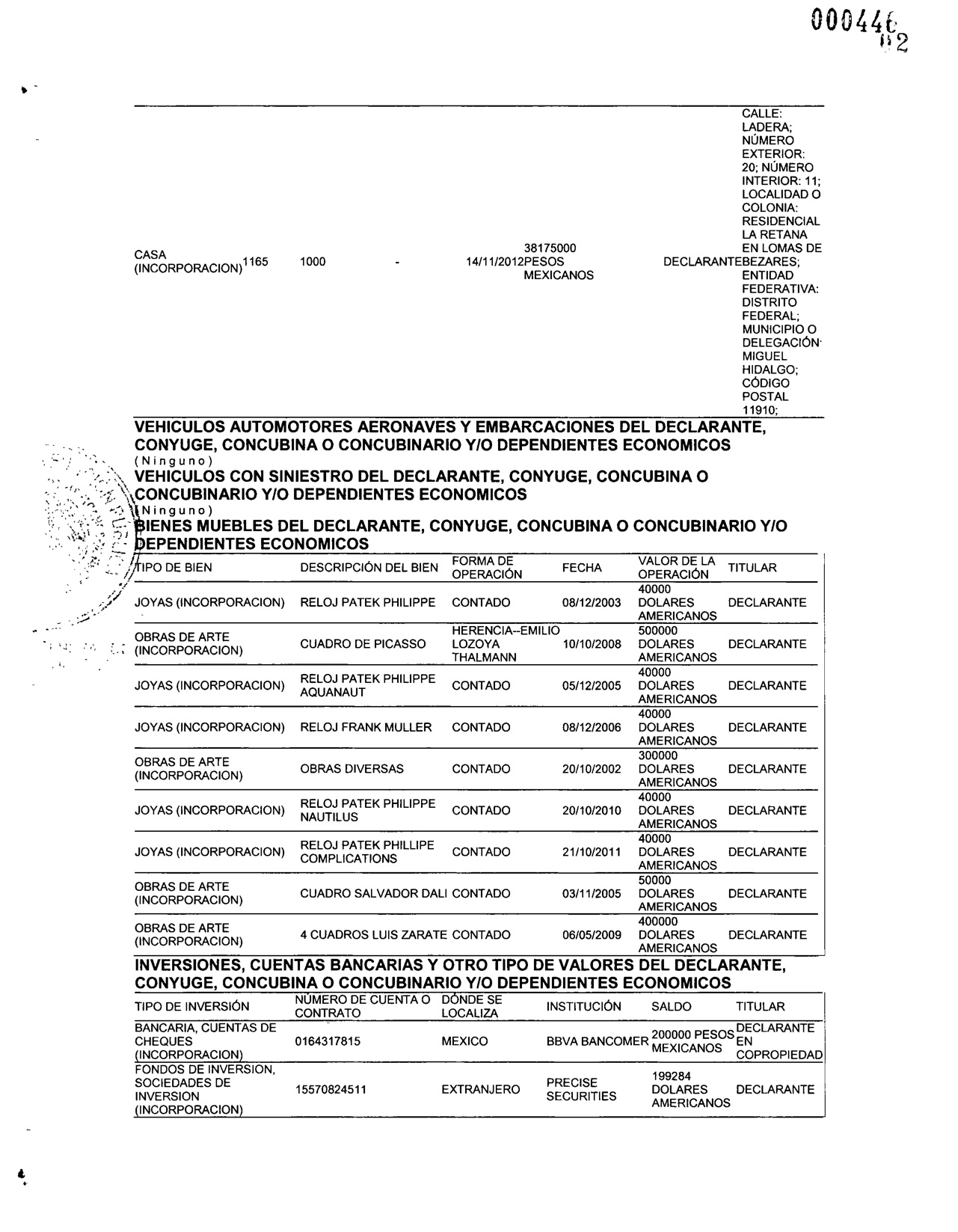 En la declaración patrimonial inicial, además del bien inmueble, los relojes y las obras de arte, había cuatro cuentas bancarias de cheques, una por 200 mil pesos y otras tres que en conjunto alcanzaban los 30 mil 598 dólares.