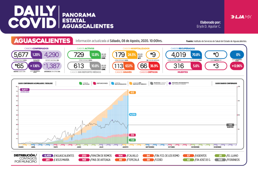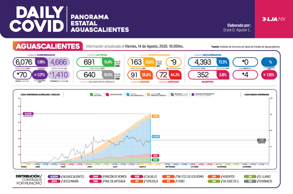 Es LJA.mx, realizamos un análisis diariamente de la situación del Covid-19 en Aguascalientes, reportando un incremento sostenido en los últimos 6 días en la tasa de letalidad y el número de defunciones, del sábado 8 de agosto al día de ayer, la tasa de letalidad paso de los 5.57% a los 5.79%, registrando 39 decesos en total, en comparación con los 34 registrados en el mismo periodo de la semana pasada