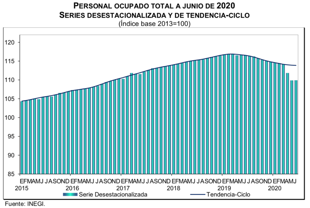 En junio de 2020, las horas trabajadas en las industrias manufactureras presentaron un incremento de 17.8% en comparación con las de mayo pasado, con cifras desestacionalizadas: las correspondientes a los obreros crecieron 20.6% y las de los empleados 12.8% mensual.