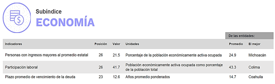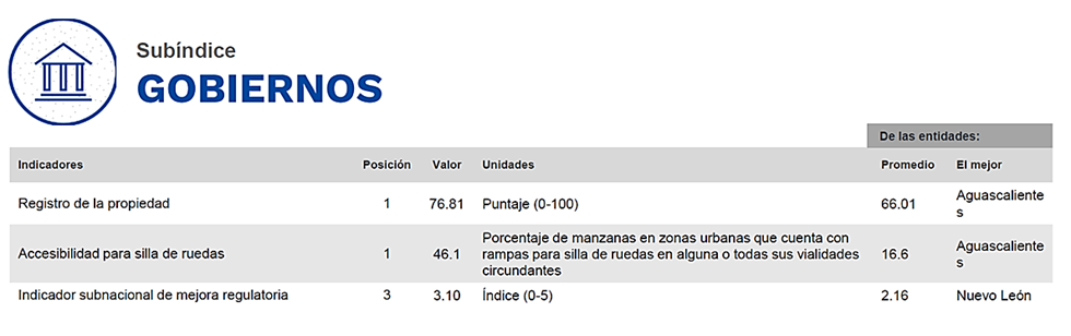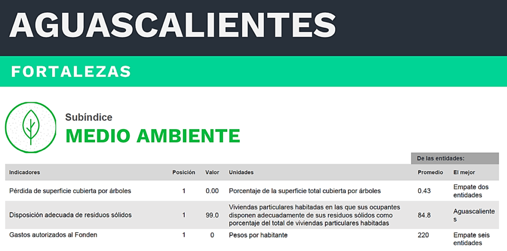 En el 2016, Aguascalientes presentaba posiciones que iban del primero al lugar 22 (con un promedio de sexto lugar nacional) y en la última lectura le corresponden lugares que van del segundo al 13, con un promedio cercano también al sexto lugar, pero solo dos indicadores se encuentran fuera de los primeros diez.