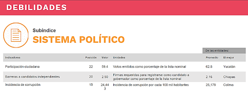 *En Sistema Político Estable y Funcional, Aguascalientes se ubica en treceavo con 44.78 puntos contra 74.97 de la entidad líder Colima. De la Región Centro Bajío Occidente es el trece y solo Querétaro se ubican dentro del top ten.