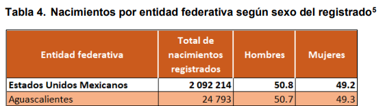 En 2019, nacimientos registrados en Aguascalientes fue de 50.7% hombres, 49.3, mujeres