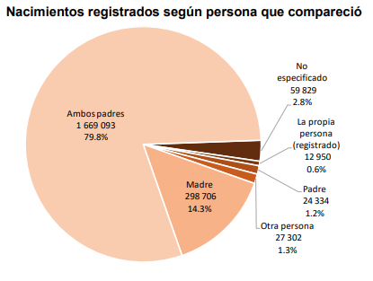 En el caso de la o las personas que comparecen a realizar el registro del nacimiento, la situación en la que ambos padres acuden representa el 79.8% (1 669 093) del total. En el segundo lugar se encuentran los casos en los que solo asiste la madre con el 14.3% (298 706). El resto de las categorías se encuentra en la siguiente gráfica.