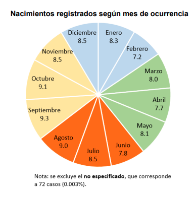 Los nacimientos registrados según el mes de ocurrencia tienen un promedio mensual del 8.3%, siendo septiembre el de mayor número de sucesos. En él se registraron 194 482 hechos (9.3%).