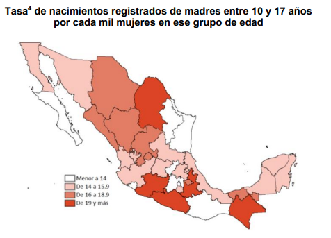 La entidad federativa con la mayor tasa de nacimientos registrados de madres entre 10 y 17 años por cada 1 000 mujeres en ese grupo de edad, es Chiapas con 25.5, y la que cuenta con la menor tasa es la Ciudad de México con 9.9. En el ámbito nacional, la tasa es de 16.2.