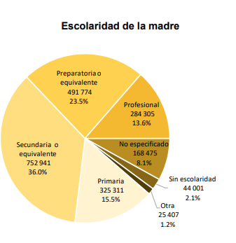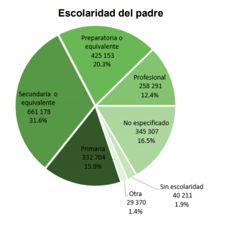 La mayor proporción de los padres cuenta con un nivel de escolaridad que, como en el caso de las madres, tampoco supera el nivel medio superior: el 31.6% (661 178) de los padres manifestó contar con secundaria o equivalente, 20.3% (425 153) con preparatoria o equivalente y el 15.9% (332 704) con algún grado de primaria. El 1.9% (40 211) manifestó no contar con algún nivel de escolaridad.