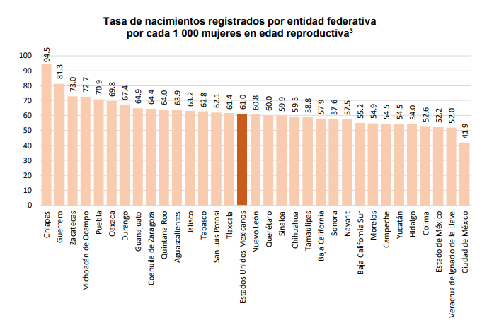 La tasa de nacimientos registrados por cada 1 000 mujeres en edad reproductiva en 2019 fue de 61. Las entidades federativas con las mayores tasas fueron Chiapas con 94.5, Guerrero con 81.3 y Zacatecas con 73. En contraparte, las que reportaron las tasas más bajas fueron Ciudad de México, Veracruz de Ignacio de la Llave y Estado de México con 41.9, 52 y 52.2, respectivamente.