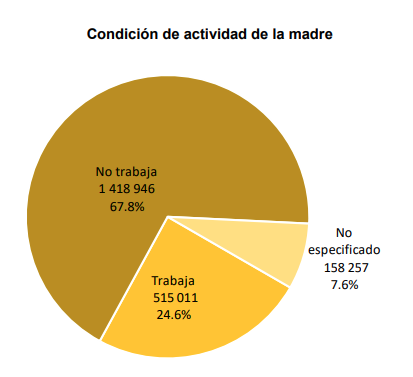 El 67.8% (1 418 946) de las madres al momento del registro declararon no trabajar, el 24.6% (515 011) reportaron que sí lo hacen y el 7.6% (158 257) no especificó su condición.