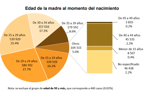 En el grupo de edad de 20 a 24 años para la madre se presenta el mayor número de nacimientos con 580 392 (27.7%) casos, seguido del grupo de 25 a 29 años con 530 920 (25.4%). Un grupo con menos sucesos es el de menores de 15 años con 8 507 (0.4%) registros. El resto de las categorías se presenta en la siguiente gráfica.