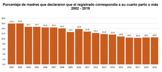 En cuanto al número de partos que ha tenido la madre al momento del registro, el 43.9% (919 411) corresponde al primero, es decir el registrado; el 28.9% (604 555), al segundo; el 16.6% (347 224) al tercero y 10.6% (221 024) al cuarto y más.