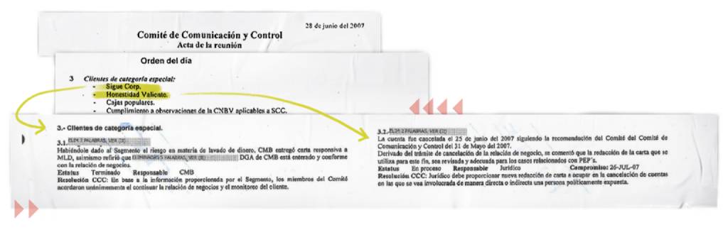 En ese punto estaba enlistada la cancelación de las cuentas de Honestidad Valiente. Sin mayor discusión, se tomó nota de la misma, hecha efectiva apenas tres días antes a propuesta del propio CCC, que calificó a la asociación como una Persona Políticamente Expuesta (PPE), es decir, personas con participación potencial en hechos de corrupción en virtud de su posición e influencia políticas.
