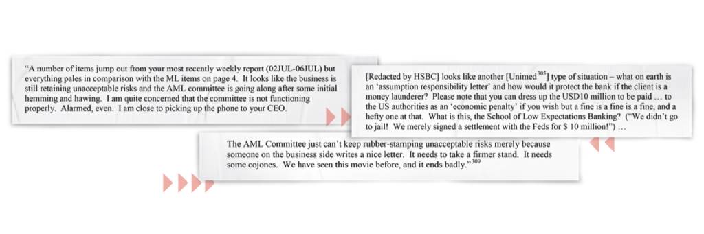 -Las decisiones tomadas por el CCC de HSBC en México durante el periodo que examinamos fueron profundamente preocupantes, como lo detallamos en el reporte. El comité no hizo nada para detectar, exhibir, reportar y detener las actividades sospechosas y cerrar las cuentas.