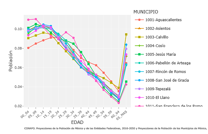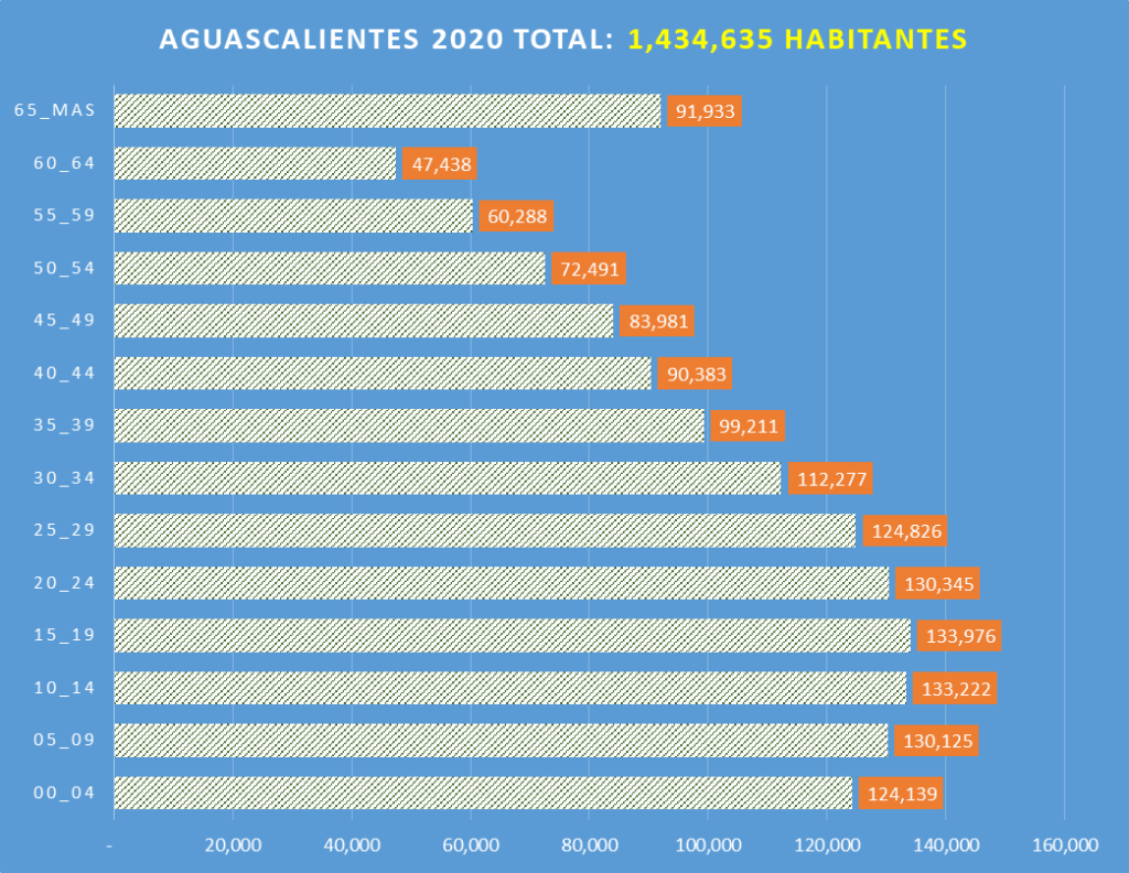 Al 30 de junio del presente año 2020 las proyecciones oficiales que el Consejo Nacional de Población (Conapo) asignó para Aguascalientes ascienden a la cantidad de UN MILLÓN 434 MIL 635 HABITANTES, de los cuales, cerca de uno de cada diez: 139 MIL 371 son ADULTOS MAYORES DE 60 AÑOS, desagregados por grupos de edad o municipios conforme a las siguientes gráficas del visualizador de indicadores del Conapo.