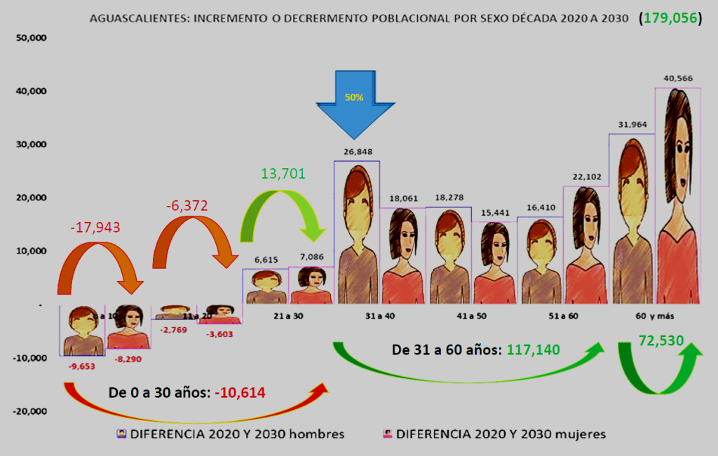 Si bien el Estado tendrá un incremento poblacional durante la próxima década, por más de 179 mil habitantes, este aumento no será homogéneo entre los grupos etarios, de hecho, decrecerá la población en edades tempranas y se verá mayor crecimiento entre los efectivos de 30 a 40 años, derivados de un crecimiento social inducido por el desarrollo industrial del estado, con un componente claramente masculino de vocación ingenieril y tecnológica. Así, de los efectivos del segundo tercio de vida provendrá el gran incremento de más del 65% del total del crecimiento del 2020 rumbo al 2030.