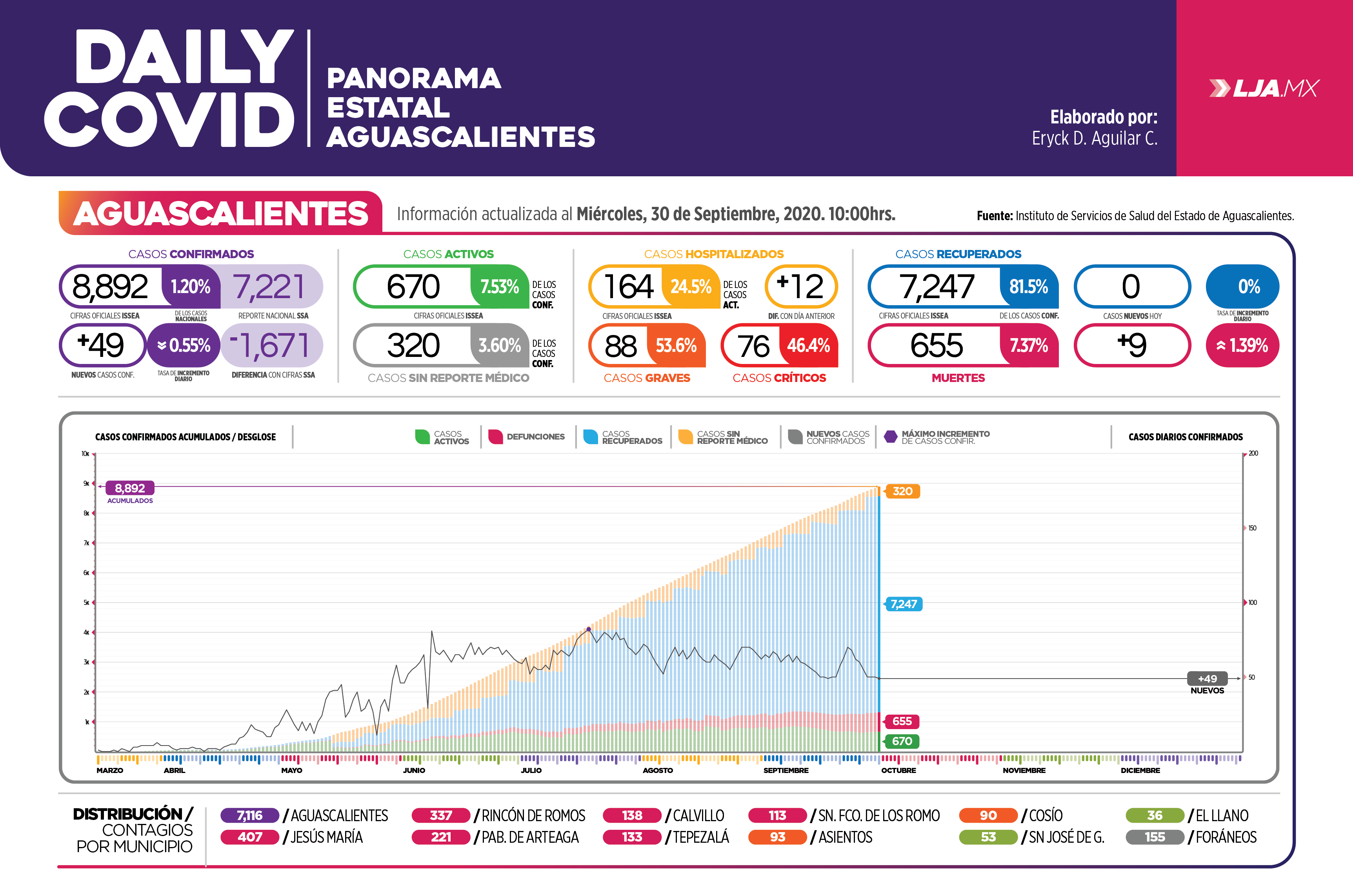 En las últimas 24 horas (30/09/2020), Aguascalientes ha registrado un incremento de 49 casos de Covid-19 y 9 muertes a causa de la enfermedad respiratoria, con este aumento el estado ya acumula 8 mil 892 contagios históricos de Covid y 655 muertes, desde el inicio de la pandemia en lo local.