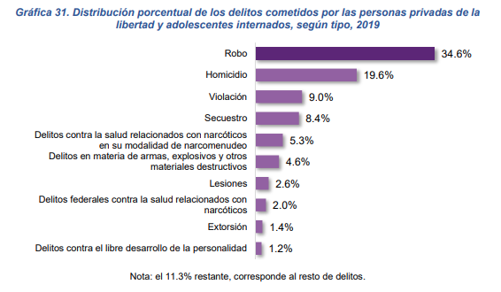 Sobre los delitos cometidos por las personas privadas de la libertad en los centros penitenciarios, se reportaron 249 601. En tanto, la cifra de delitos cometidos por los adolescentes internados en los centros especializados de tratamiento o internamiento fue de 1 520. Robo fue el delito de mayor frecuencia con 34.6% del total nacional.