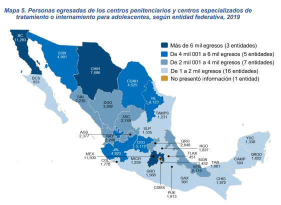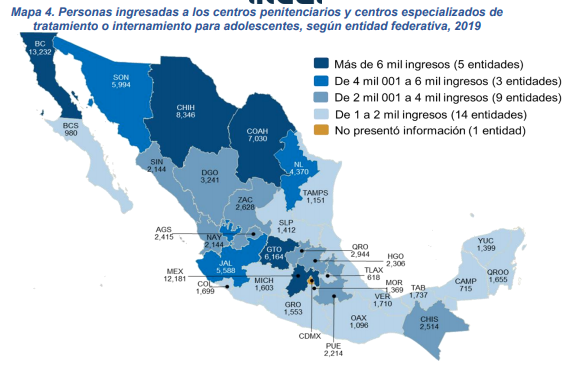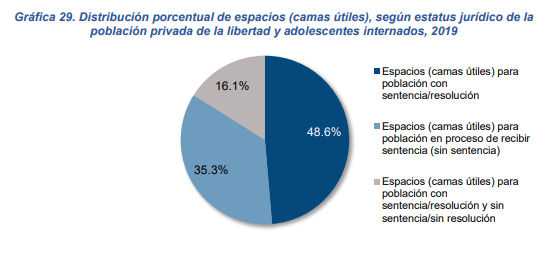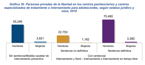 Al cierre de 2019 se encontraban privadas de la libertad 155 400 personas en los centros penitenciarios y 1 322 adolescentes internados en los centros especializados de tratamiento o internamiento. Del total de esta población, 94.7% eran hombres y 5.3% eran mujeres. Con relación al estatus jurídico que presentó la población privada de la libertad en los centros penitenciarios, 58 753 personas se encontraban sin sentencia; en cambio, 96 647 personas contaron con sentencia. Por su parte, los centros especializados de tratamiento o internamiento reportaron 314 adolescentes con Medida cautelar de internamiento preventivo y 1 008 más en Internamiento y Semi – internamiento o internamiento en tiempo libre.