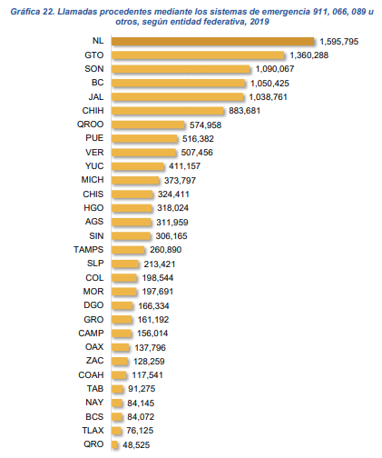 Durante 2019, en el ámbito nacional, se registraron 12 785 150 llamadas procedentes mediante los sistemas de emergencia 911, 066, 089 u otros. Aguascalientes reportó 311,959 llamadas procedentes de los sistemas de emergencia