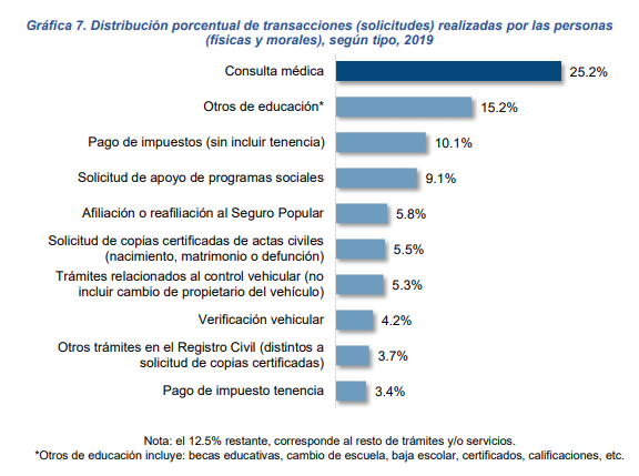 Durante 2019 se realizaron 228 497 524 transacciones (solicitudes) por las personas (físicas y morales) ante las instituciones de las administraciones públicas estatales14. Destaca Consulta médica como el trámite y/o servicio de mayor frecuencia con 25.2% del total.