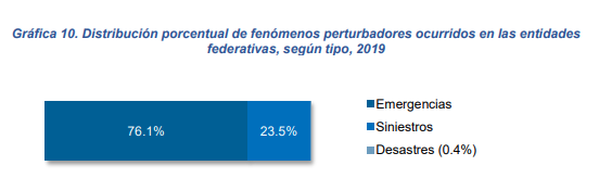 Durante 2019, se reportaron 42 329 fenómenos perturbadores ocurridos en las entidades federativas. De ellos, 76.1% fueron emergencias
