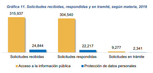 En cuanto al tema de transparencia, las administraciones públicas estatales reportaron un total de 340 781 solicitudes recibidas en materia de acceso a la información pública y de protección de datos personales; al respecto, se respondieron 326 757 solicitudes y 11 618 más se encontraron en trámite al cierre de 2019.