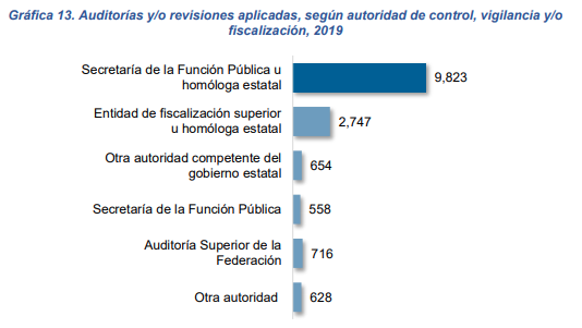 En cuanto al ejercicio de la función de control interno y anticorrupción, durante 2019 se aplicaron 15 126 auditorías y/o revisiones a las instituciones de las administraciones públicas estatales por parte de las autoridades de control, vigilancia y/o fiscalización
