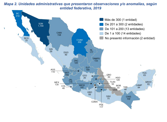 4 851 unidades administrativas presentaron observaciones y/o anomalías derivadas de estas auditorías y/o revisiones. Sonora registró el mayor número de unidades administrativas que presentó observaciones y/o anomalías con 1 704.